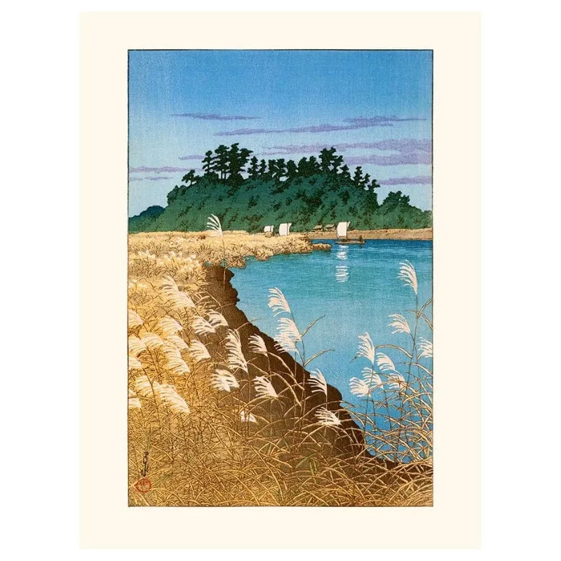 Découvrez l’Affiche Japonaise Estampe Ichikawa, une invitation au voyage artistique. Plongez dans l’univers paisible de Kawase Hasui à travers une scène d’Ichikawa en fin d’automne, aux couleurs apaisantes et à l’atmosphère sereine.