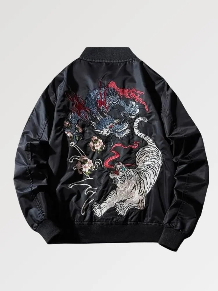 La finesse des motifs de dragon et de tigre brodés sur ce bomber ajoute une touche de personnalité et de raffinement à toute tenue. Porté avec assurance, il devient un élément essentiel pour une garde-robe moderne et inspirée, soulignant l’élégance et la sophistication de ceux qui le portent.
