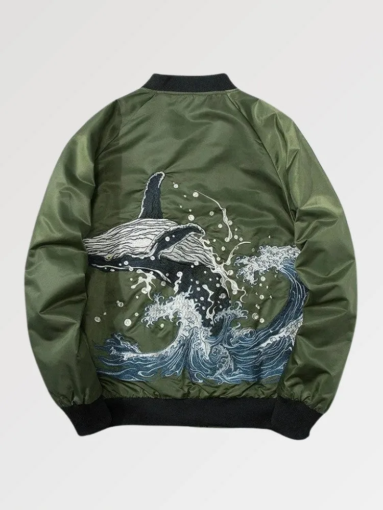 Associez la tradition japonaise à la mode contemporaine avec ce bomber captivant. Plongez dans l’impact visuel du design inspiré de la vague de Kanagawa et de la broderie délicate de la baleine, symbole de puissance. Faites du bomber une pièce statement unique dans votre garde-robe, explorant un univers artistique et culturel incomparable.